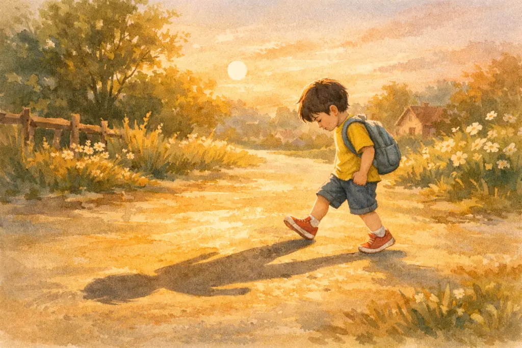 傍晚回家的路上,太阳把地面照得金黄金黄。我低头一看,咦,脚边那个长长黑黑的家伙怎么又跟着我?我跑一步,它也跑一步。它为什么总跟着我呀?