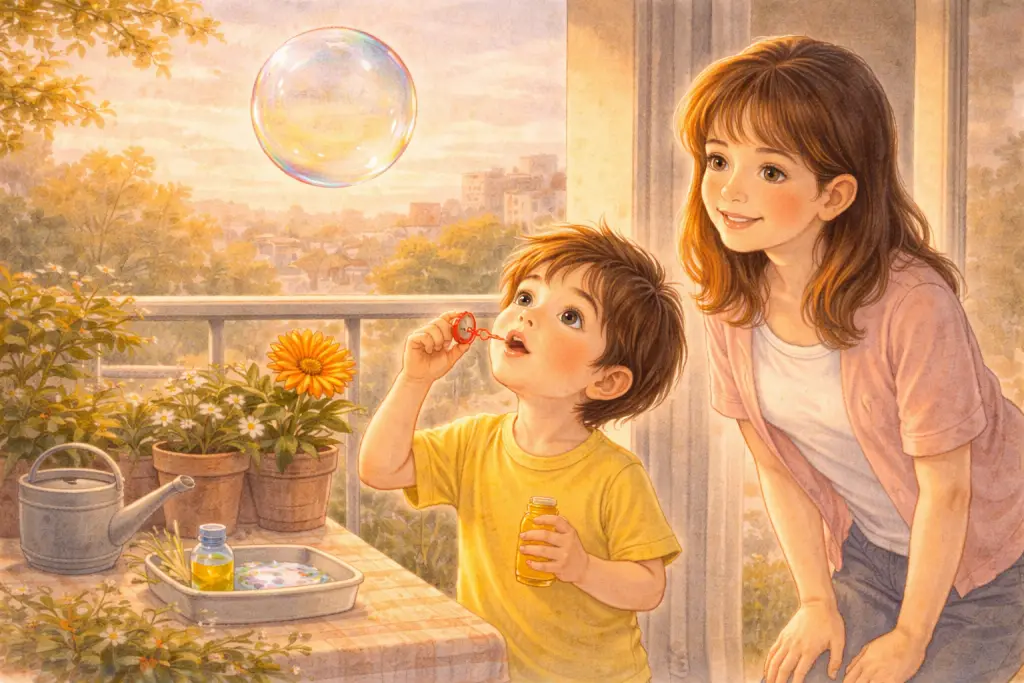 傍晚的阳台上,我举起泡泡圈轻轻一吹,一个亮晶晶的泡泡慢慢鼓起来,晃一晃,就圆圆地飞走了。我追着它跑了两步,忍不住问妈妈:“为什么我吹出来的泡泡,总是圆圆的呀?”