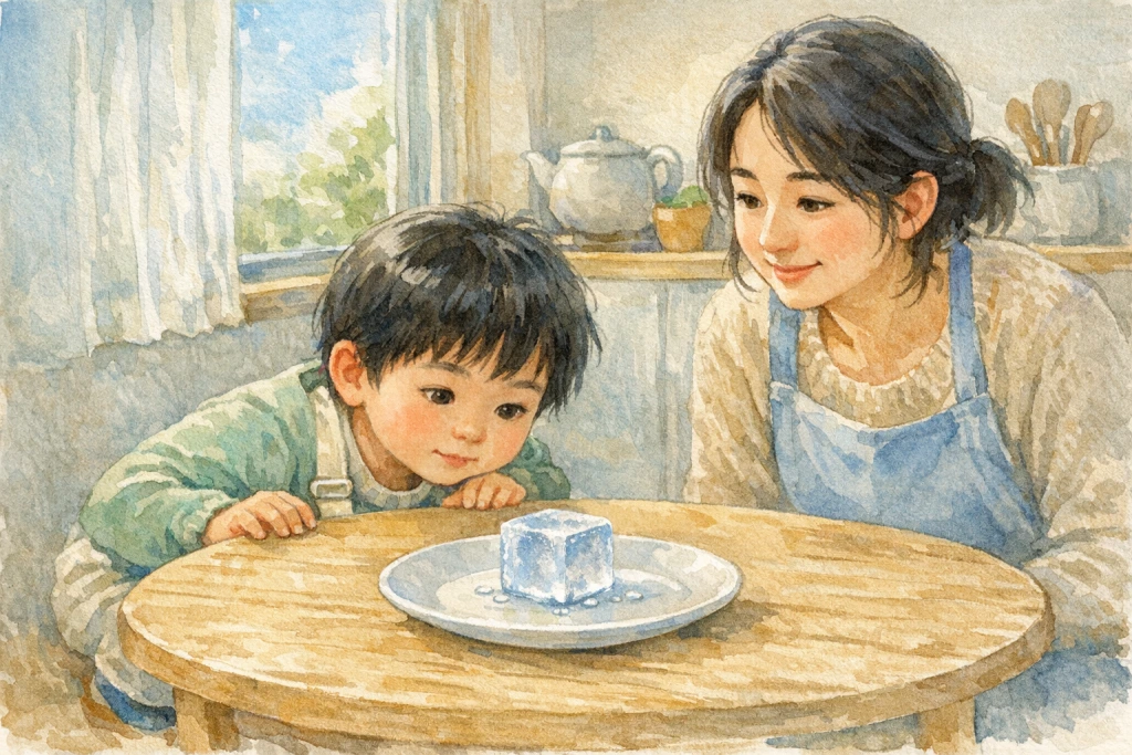 妈妈从冰箱里拿出一块小冰,放在白白的小盘子里。我蹲下来盯着它看,没过一会儿,冰块脚边就冒出了一圈亮晶晶的小水。我抬头问妈妈:“它刚才还硬硬的,为什么会慢慢化掉呀?”