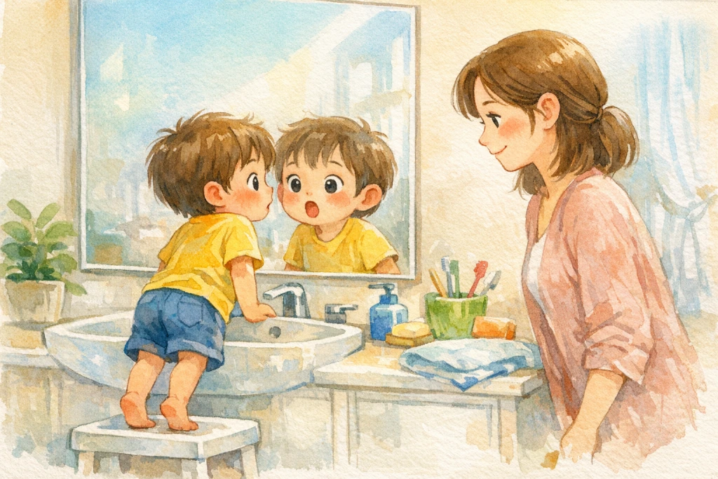 早上洗脸的时候,我一抬头,镜子里也有一个圆圆眼睛的小朋友,正和我一起看过来。我眨眨眼,他也眨眨眼。我忍不住问妈妈:“镜子为什么会照见我呀?”