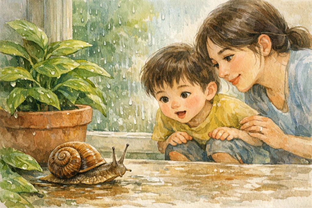雨停以后,我蹲在窗台边的花盆旁,看见一只小蜗牛正慢慢往前爬。它走得一点也不急,可背上却驮着一间卷卷的小房子。我忍不住小声问妈妈:“蜗牛为什么总要背着它呀?”