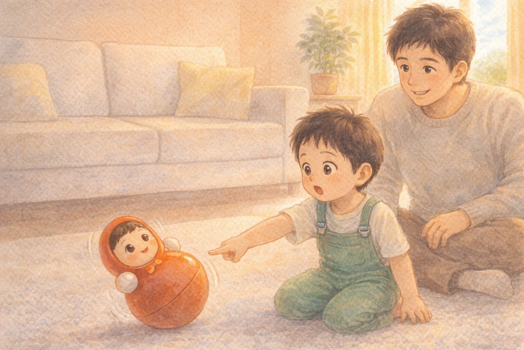 客厅的地垫上,我伸出手指轻轻一推,不倒翁歪到一边,晃了两下,居然又自己站好了。我盯着它看了又看,忍不住问爸爸:“它都被推歪了,怎么还会站回来呀?”